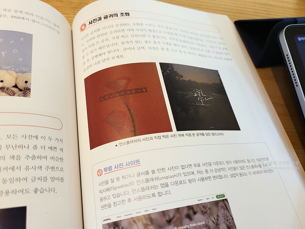 - 원하는 글씨를 멋지게 쓰는 것 외에도, 그것을 후보정하고, 좋은 사진 위에 이리저리 얹어보고, 내가 그린 캘리그라피나 드로잉으로 스티커/달력을 만드는 등 직접 굿즈를 제작해보는 방법과 절차까지 안내되어 있다.