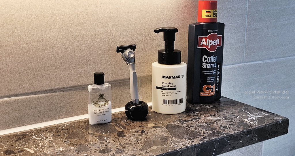 평소에 이렇게 두진 않고 (핸드워시 쓰고 나면 통 주변에 물기가 많이 흐르니까) 세면대에 올려놓는데, 진한 통의 샴푸 옆에 놓으니 또 예쁘네.