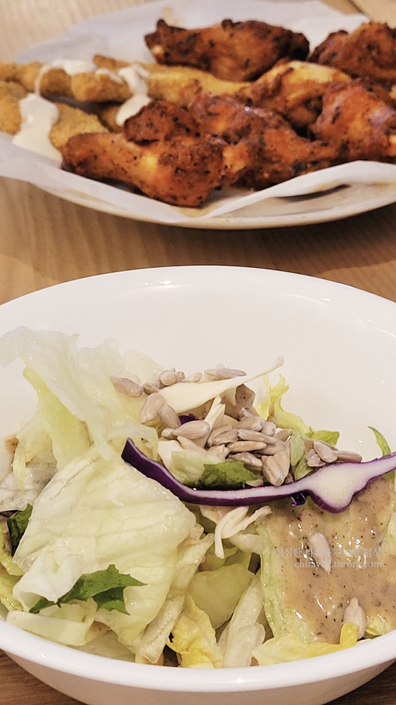 버팔로 치킨봉과 용가리, 해바라기씨 샐러드로 해결할 거니까 이따 새벽쯤 배가 고플 것이다 (? ㅠㅠ)