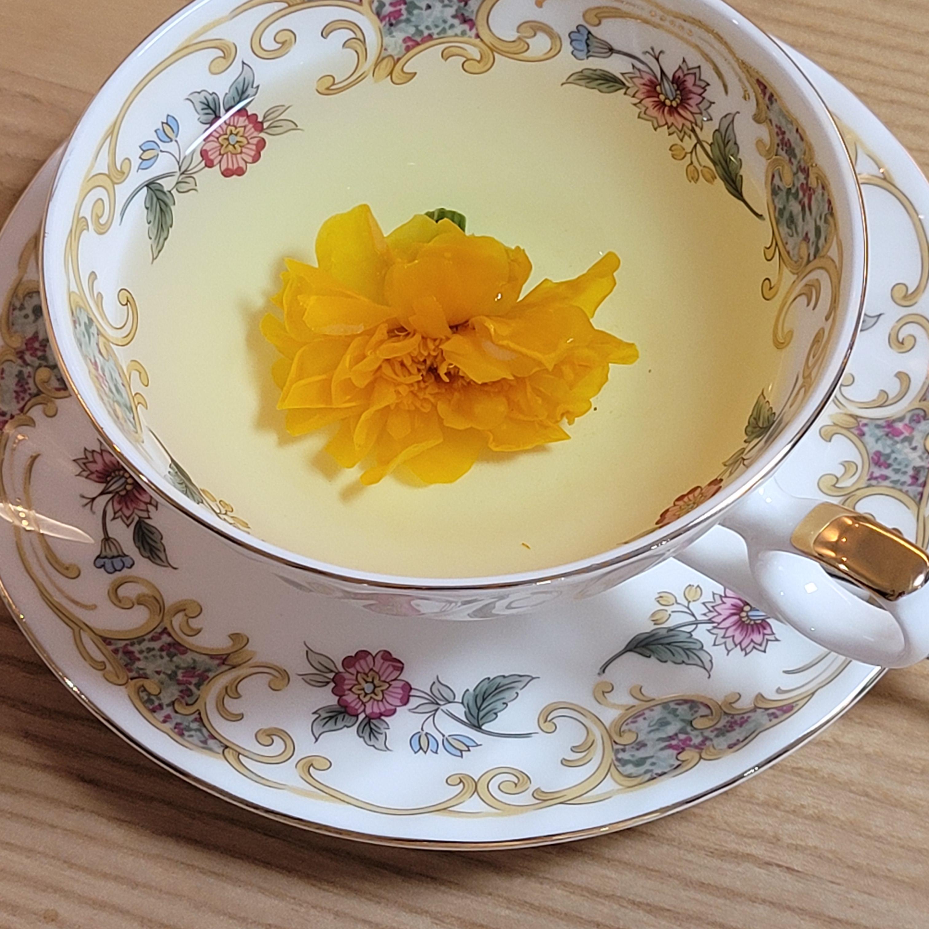 찻잔에 피어난 메리골드 꽃차의 비주얼과 찻색에 비해 향기가... 아니 냄새가 ... 너무 별로였기 때문. ㅋㅋㅋ