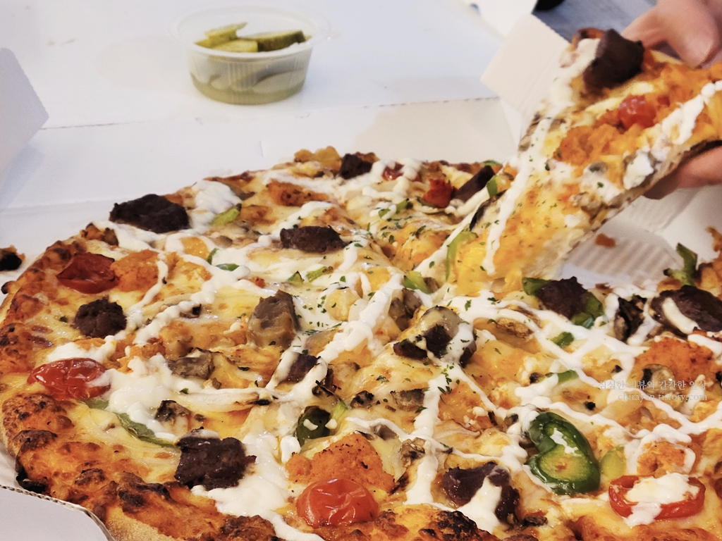 그리고 우리는 추가소스를 안 뿌려 먹고 피클도 안 먹는 편인데, 이 블랙앵거스피자만큼은 피클 한통을 순삭했고, 콜라도 평소보다 많이 마셨고, 함께 배달되는 갈릭디핑이며 핫소스류도 다 뿌려보게 되더라. 맛이 워낙 강한편이라 그런듯.