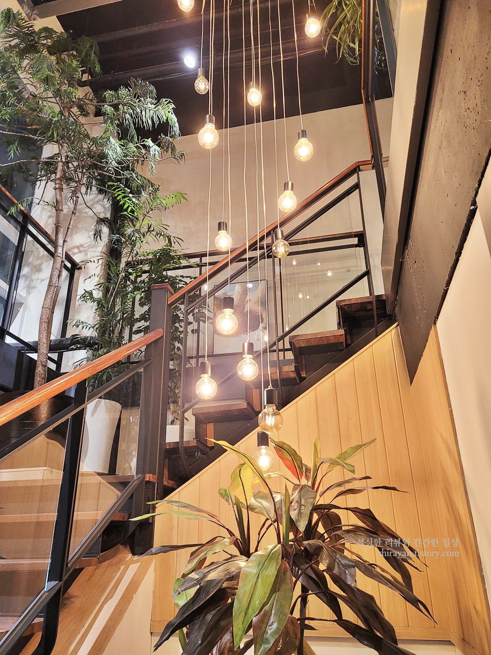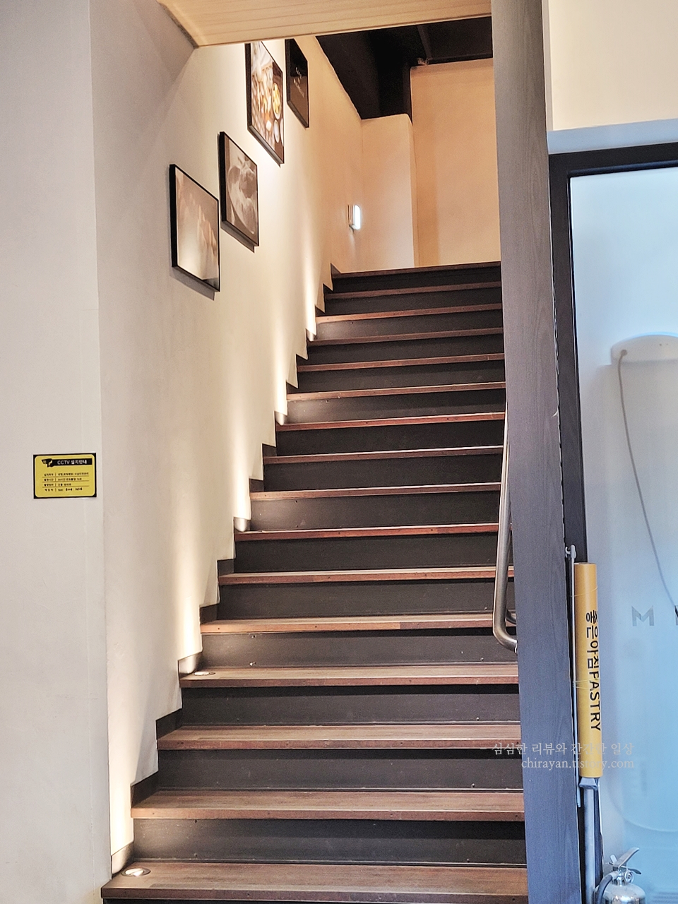 이렇게 2층으로 이어지는 계단을 올라야 고객 취식 공간, 테이블이 있다. 직원과 고객의 동선이 잘 분리되어 있는데, 아마도 의도된 것이라기보다... 이 빌딩의 1층 구성이, 좌측부터 건물출입구, 이 카페입구, 기계식주차장 입구. 이다 보니..