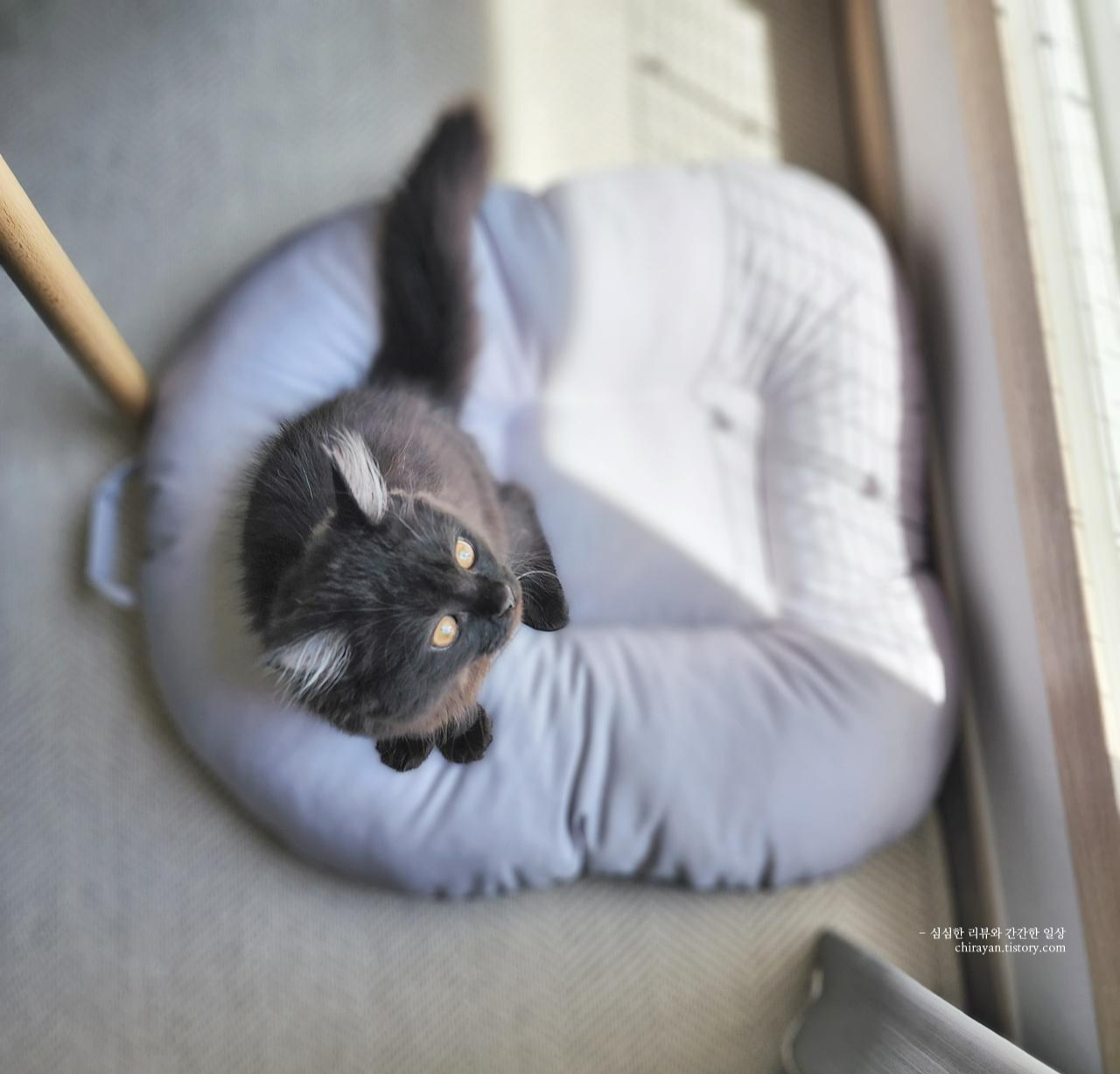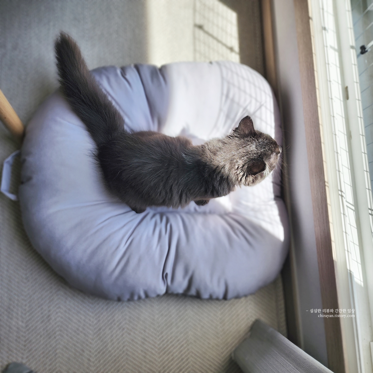 눈치 빠른 집사가 볕이 드는 창가로 방석을 옮겨두었다옹.