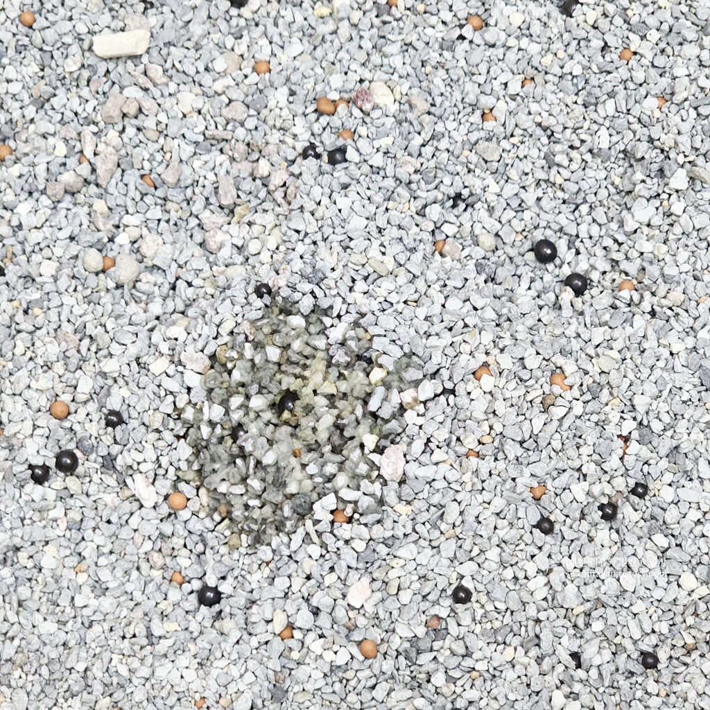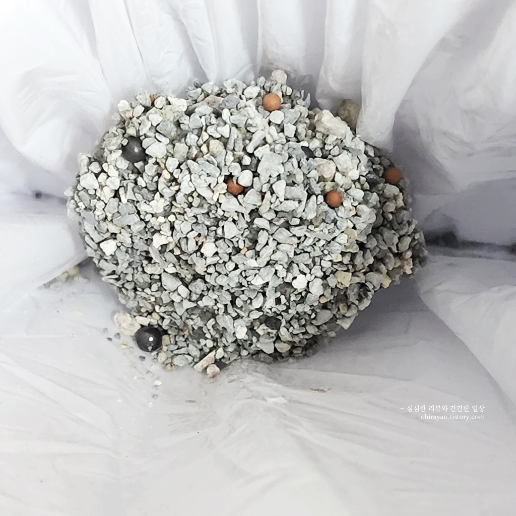 - 사진상의 모래 속 3색 알갱이는 황토볼(세균번식 억제), 제올라이트(탈취, 습기제거), 야자 활성탄(탈취).