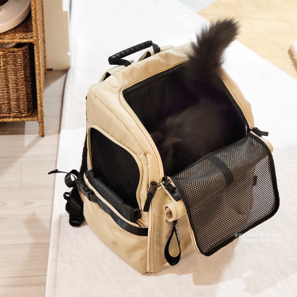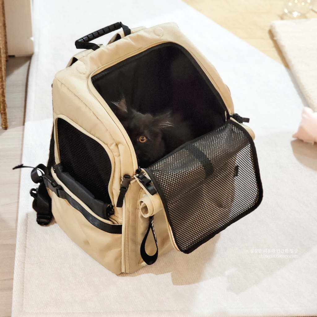 외부에 이동할 일이 있을 때, 이동장 캐리하는 경우에는 내부에 배변패드를 깔아야 한다.
