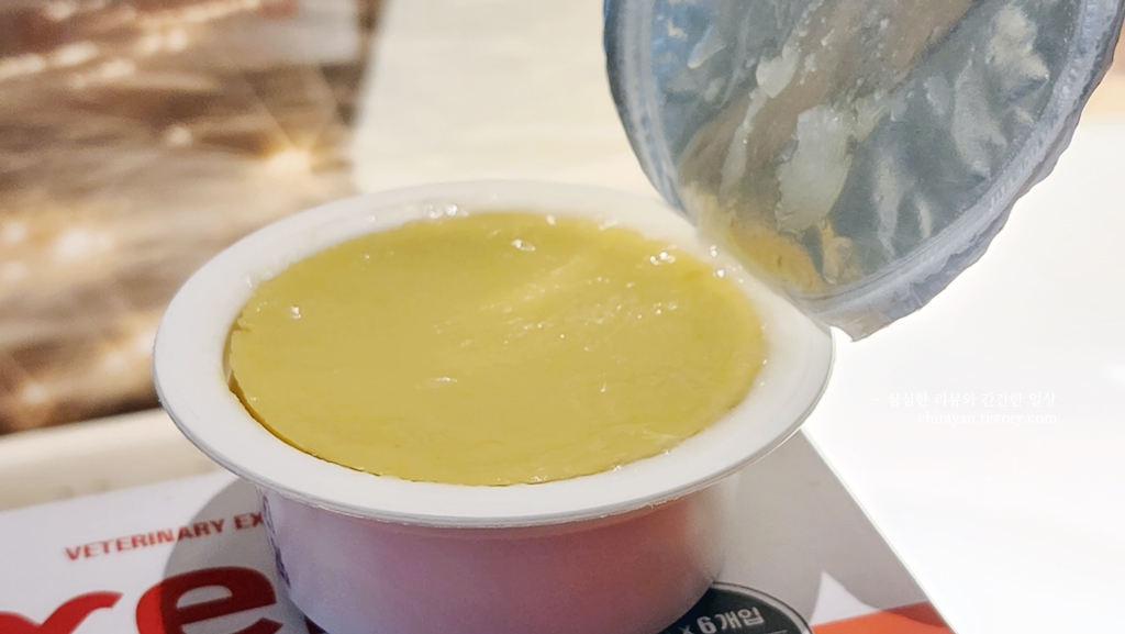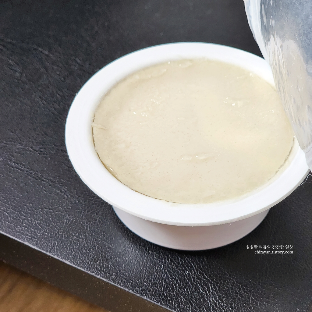 주사기로도 잘 뽑히는 무스형태의 제형이며, 부드러운 파테와 단단한 푸딩 중간쯤의 느낌이다.