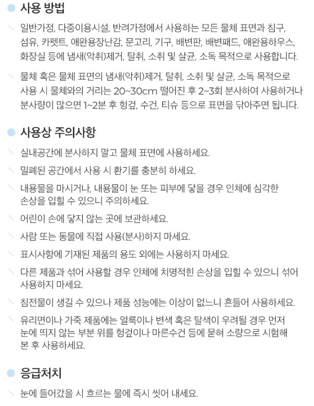 공간이 아닌 물체 표면에 뿌려서 사용해야 한다.
