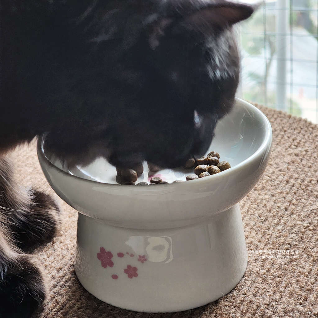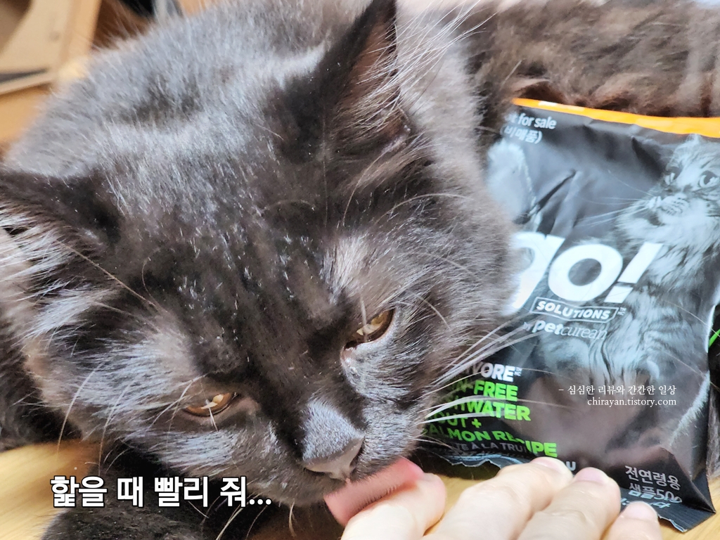 그 다음 급여분 역시 와구와구시다. 이제 익숙해지지 않았나 싶었는데 역시 혀를 앞으로 내밀어가며 사료알을 입 안에서 굴려 먹는다.