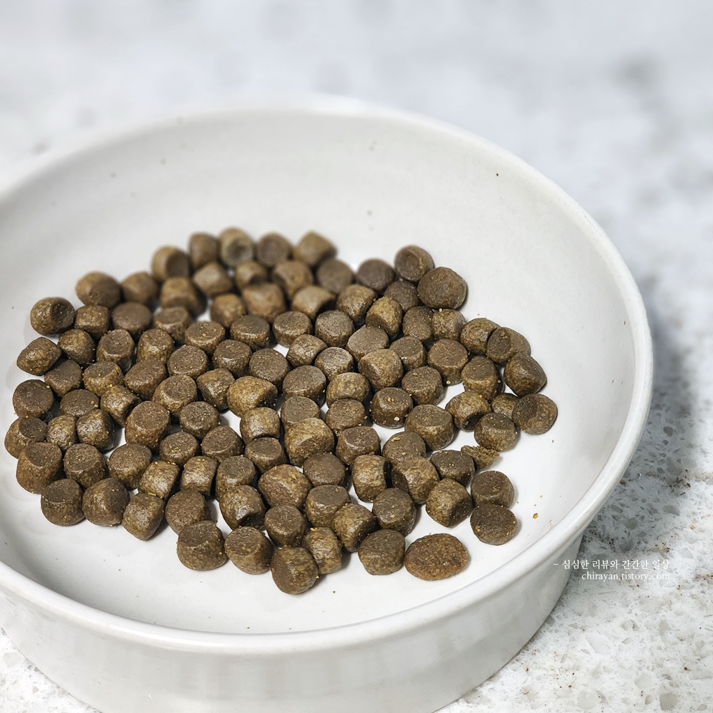 *알갱이는 전면 - 옆면가로 - 옆면세로 - 전면표준1 - 전면표준2 의 순으로 나열함 사진에서처럼 힐스키튼과 거의 유사한 키블형태, 더욱 진한 색이다.