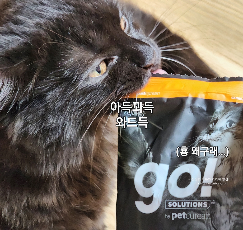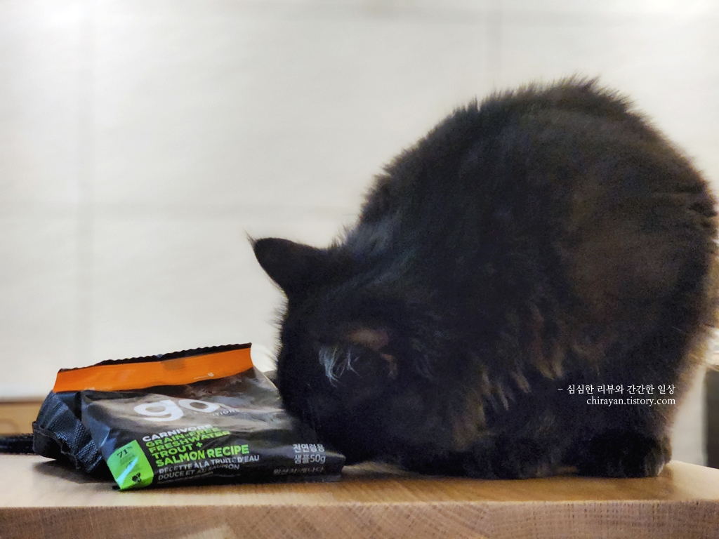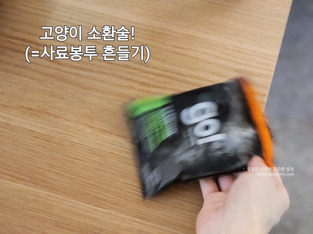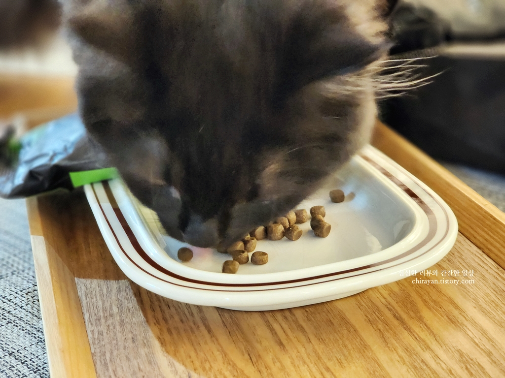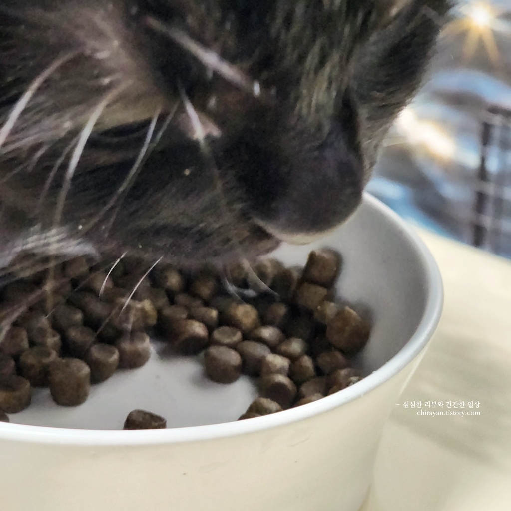 첫 급여량을 다 먹고 나서도 사료봉지 근처를 배회하는걸 보면 마음에 들긴 한 것 같다. 첫 인상은 합격인듯.