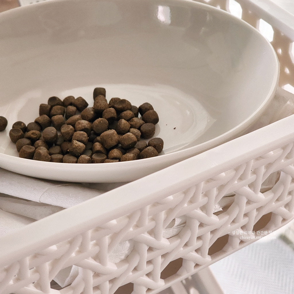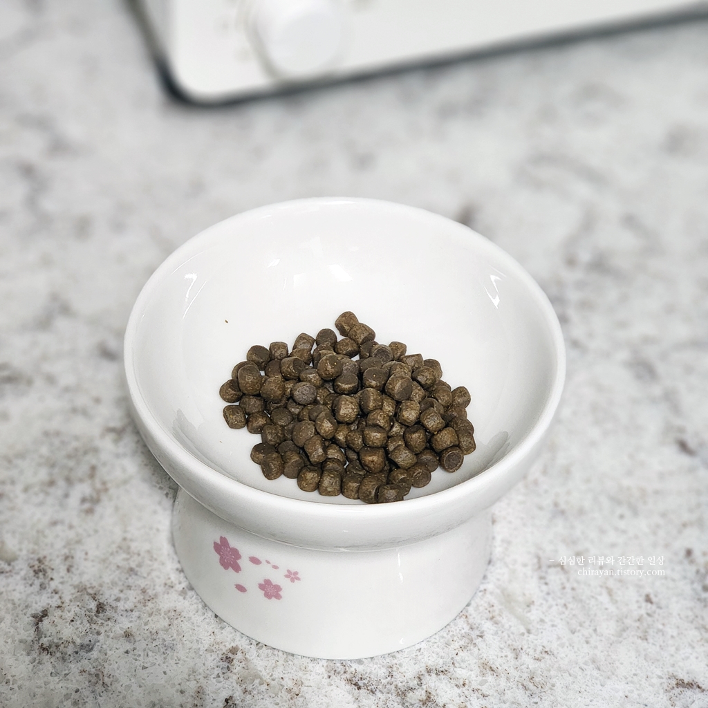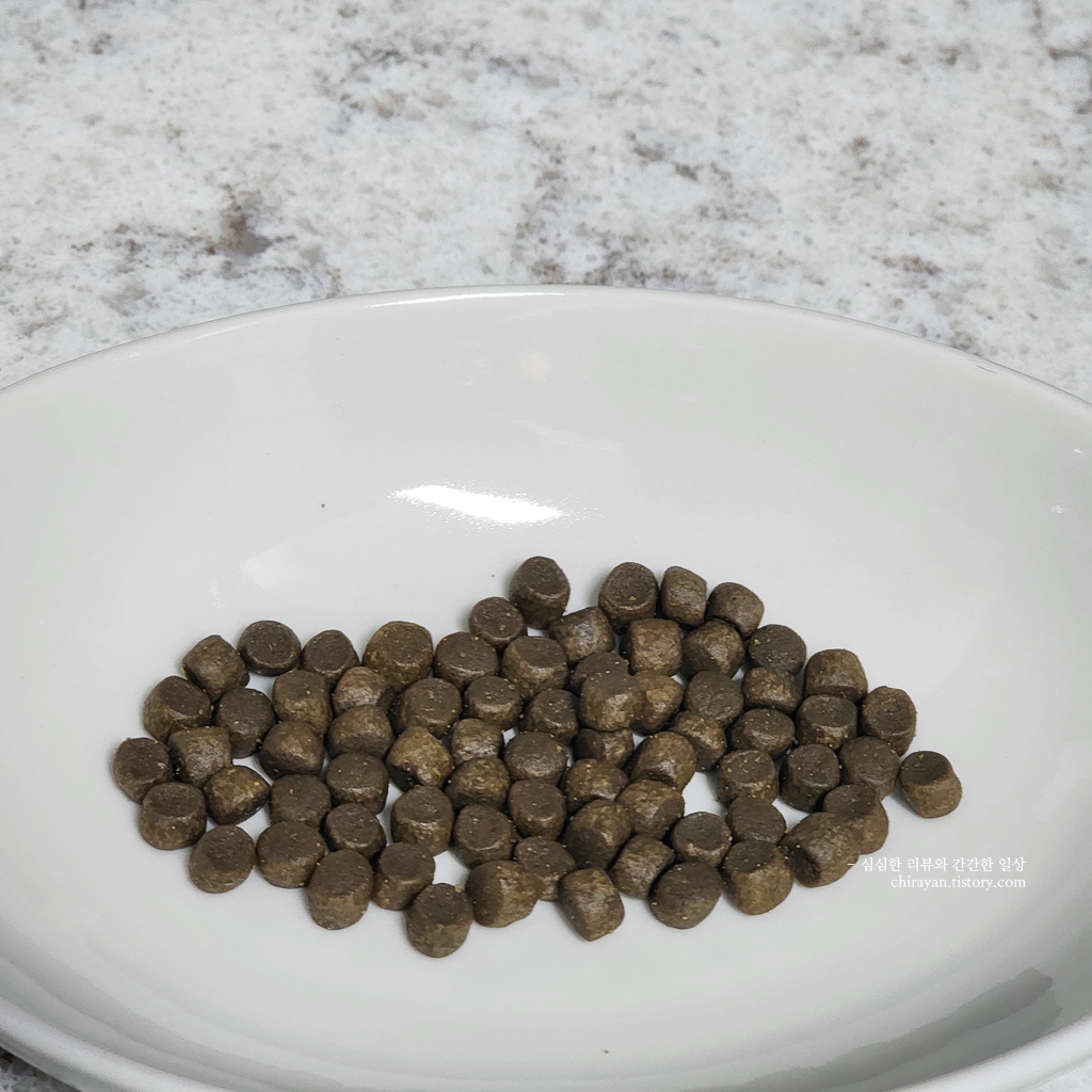 작은 그릇에 담아서 그런지 많아보인다. ( 식사 전 던져주는 사료 3알 중 한 알이 섞여 있음 )