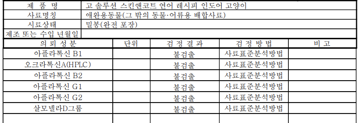 하지만 EU, FDA and CFIA certified 를 획득한 제조시설에서 최고의 품질관리로 제품을 생산하고 있으며, 캐나다에서의 검정 및 국내 국가기관에서의 검정을 거쳐 들어오는 제품이므로 품질이상이나 영양의 불균형은 아니기에 안심하고 급여를 해주셔도 괜찮습니다.
