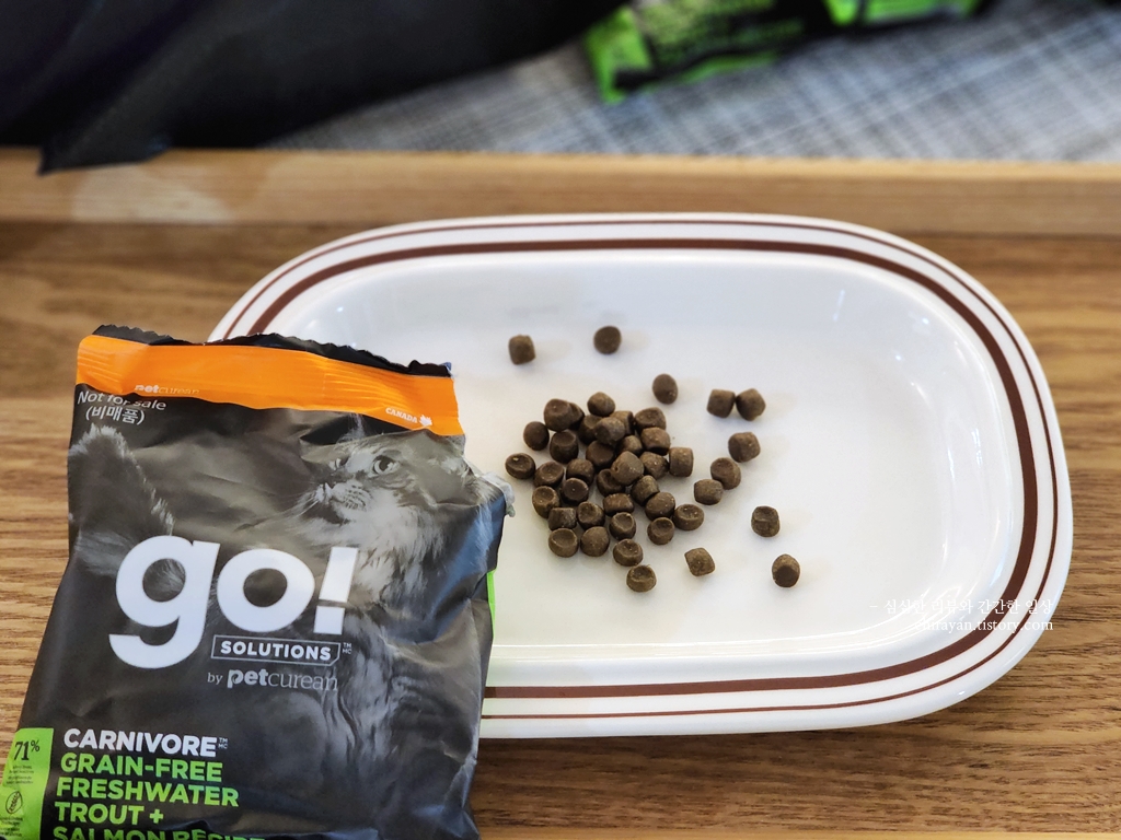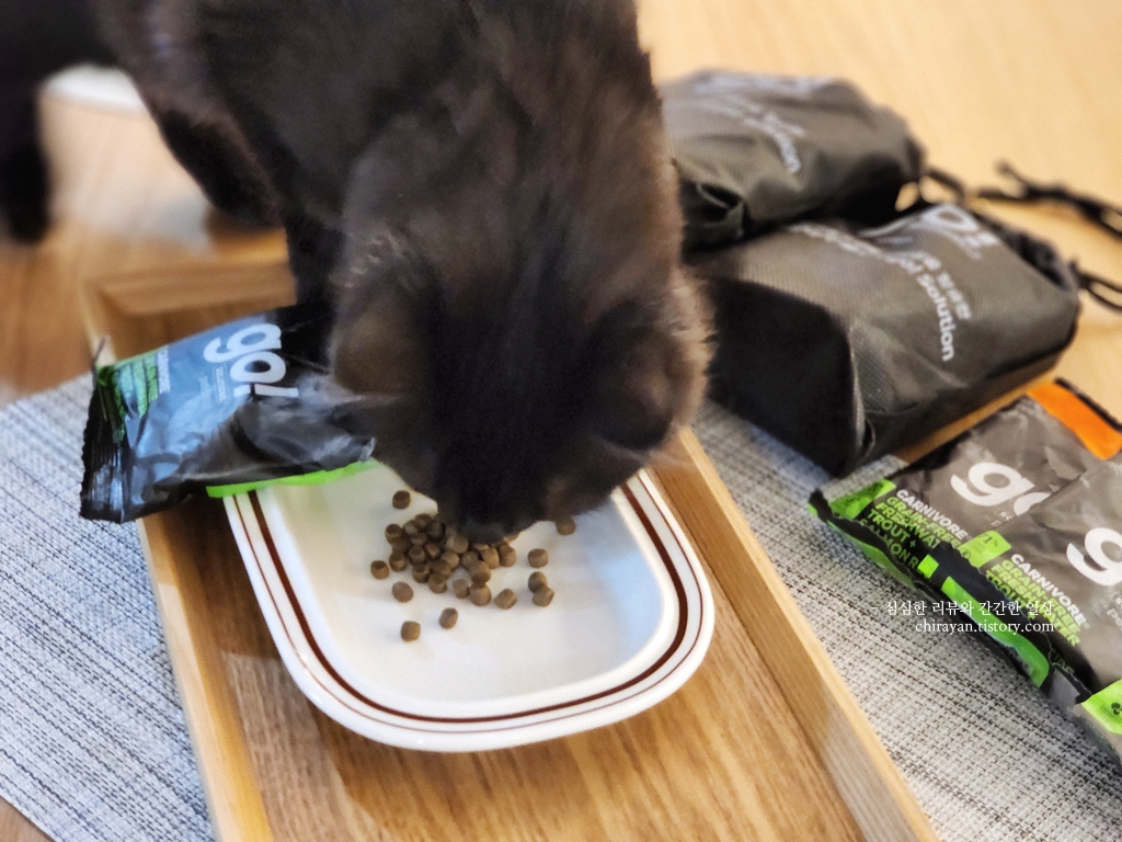 오늘은 첫 급여고, 빌리고 처음 먹어보는 사료라 간식이라고 생각할 수 있어, 일단 지켜보기로 했다. 1일차에는 총 6회의 급여타임 중 2회를 고솔루션 카니보 송어연어(5g) 급여했다.