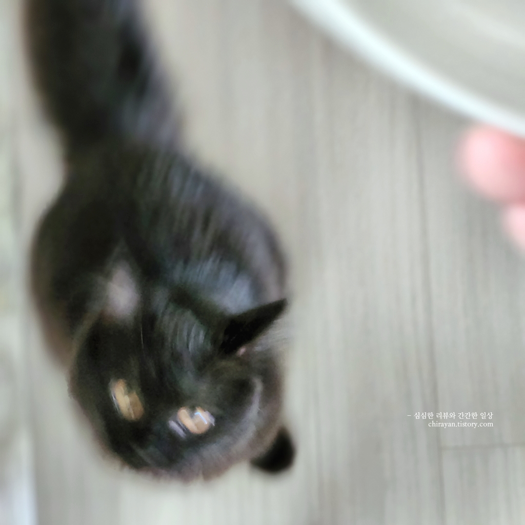 둘째날 급여량이 늘어난만큼 나머지 회차의 사료 급여량을 줄이면서, 정확한 소화상태 확인차 매일 동일츄르로 급여하는 츄르탕을 제외하고는 간식 없이 이틀을 지켜봤는데 서서히 적응해가는 것 같다.