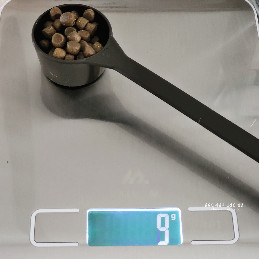 첫 봉지의 기호성 뿐 아니라 급여기간 내내의 주 단위 기호성, 그리고 급여량을 조절해가며 최적의 소화상태까지 체크해볼 수 있는 양이었다