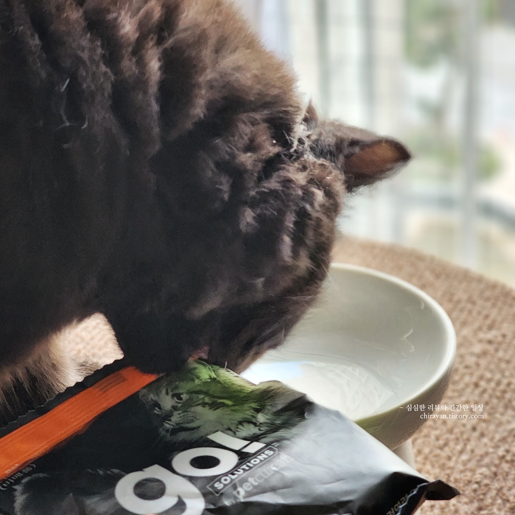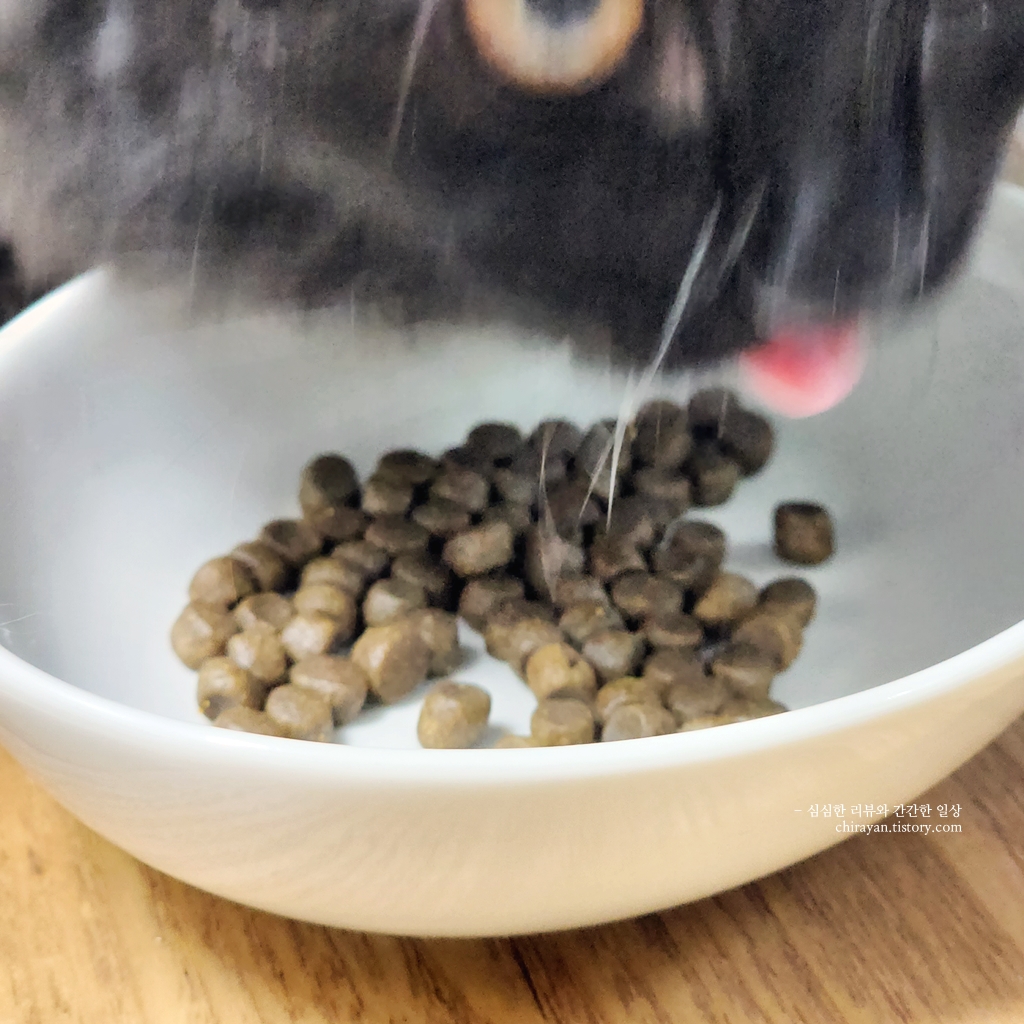 첫 급여량을 다 먹고 나서도 사료봉지 근처를 배회하는걸 보면 마음에 들긴 한 것 같다. 첫 인상은 합격인듯.