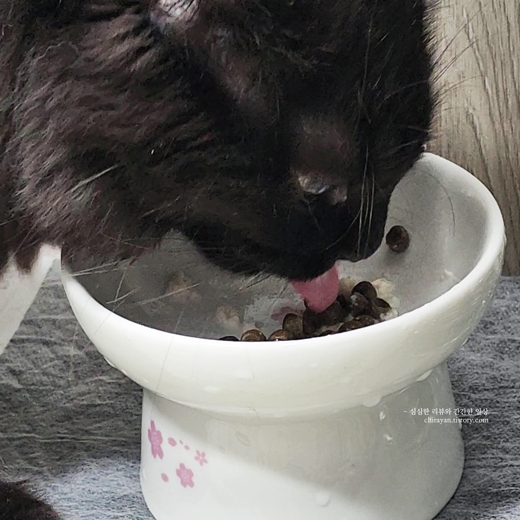 그 다음 급여분 역시 와구와구시다. 이제 익숙해지지 않았나 싶었는데 역시 혀를 앞으로 내밀어가며 사료알을 입 안에서 굴려 먹는다.