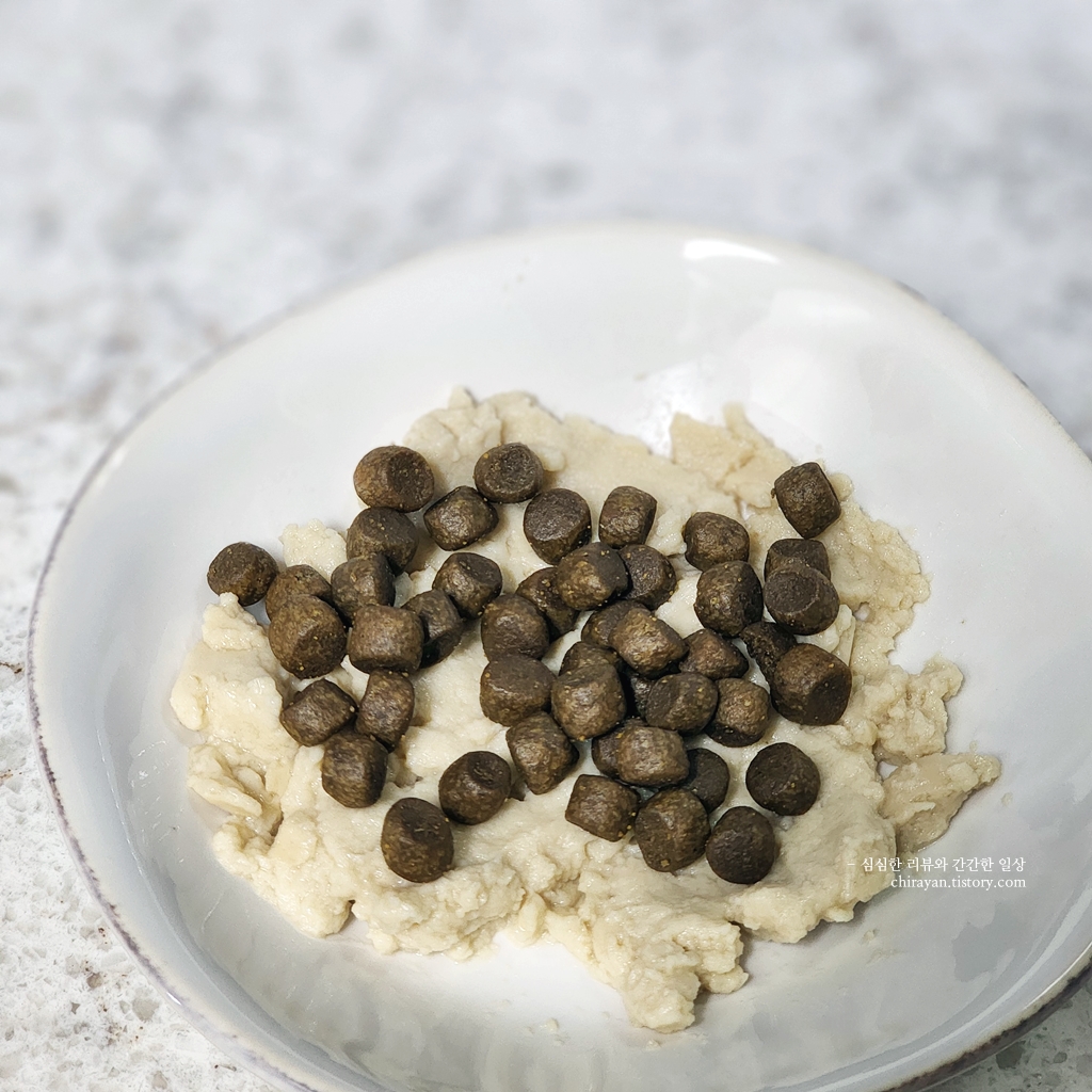 마지막 급여분은 닭가슴살 베이스인 습식 위에 6g을 토핑급여하는 식으로(주말식 형태) 급여형태를 바꿔봤다.