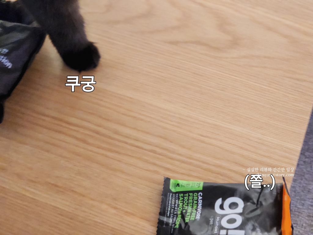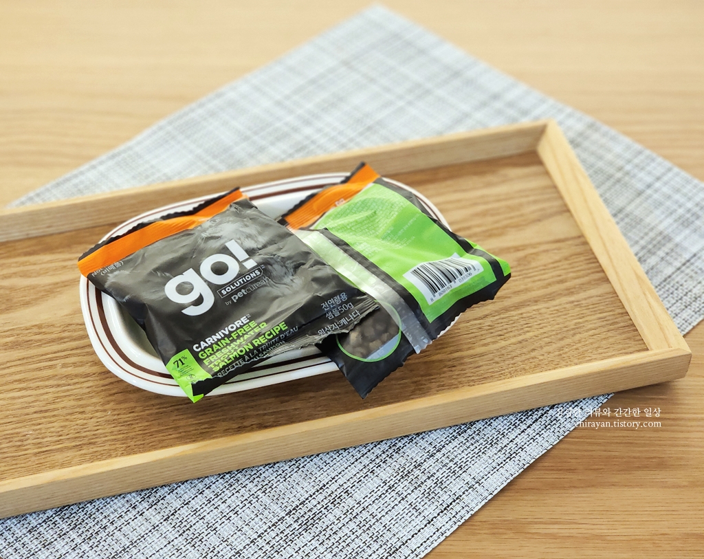 오늘은 첫 급여고, 빌리고 처음 먹어보는 사료라 간식이라고 생각할 수 있어, 일단 지켜보기로 했다. 1일차에는 총 6회의 급여타임 중 2회를 고솔루션 카니보 송어연어(5g) 급여했다.