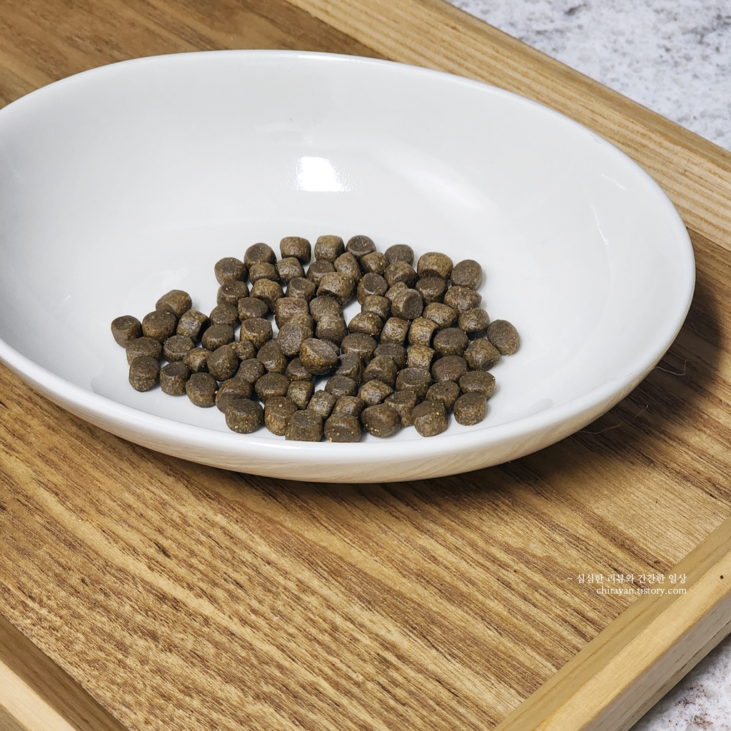 작은 그릇에 담아서 그런지 많아보인다. ( 식사 전 던져주는 사료 3알 중 한 알이 섞여 있음 )