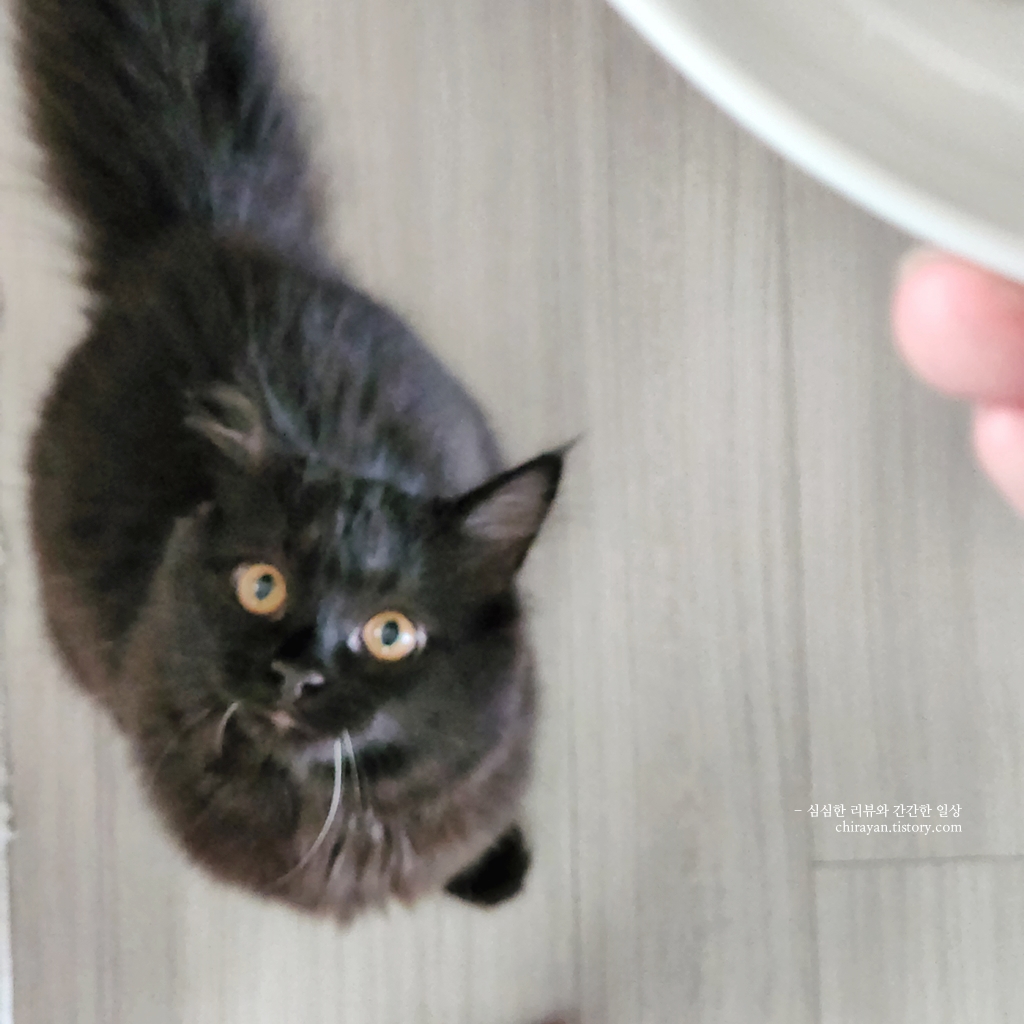 둘째날 급여량이 늘어난만큼 나머지 회차의 사료 급여량을 줄이면서, 정확한 소화상태 확인차 매일 동일츄르로 급여하는 츄르탕을 제외하고는 간식 없이 이틀을 지켜봤는데 서서히 적응해가는 것 같다.