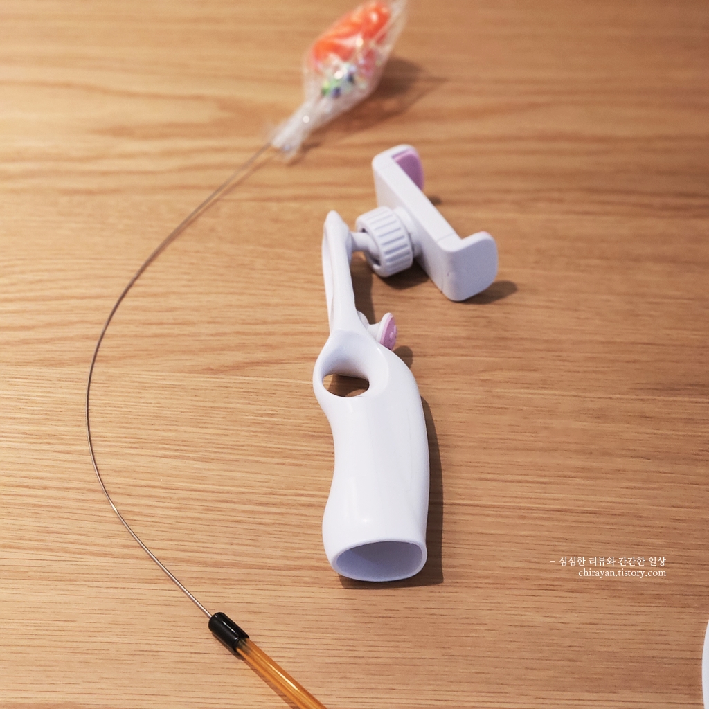 이 뒷면의 장난감 고정홀이 낚시대 손잡이를 꽉 잡아주니 촬영시에도 안정적이다.