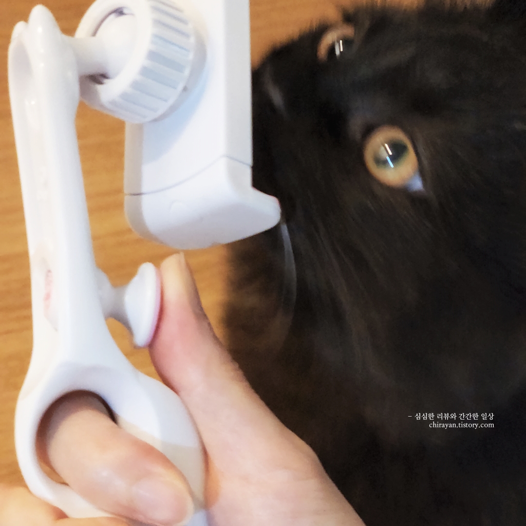 아주 안적적으로 파지하면서도, 고양이의 갑작스러운 공격시에도 손과 휴대폰을 지킬 수 있도록