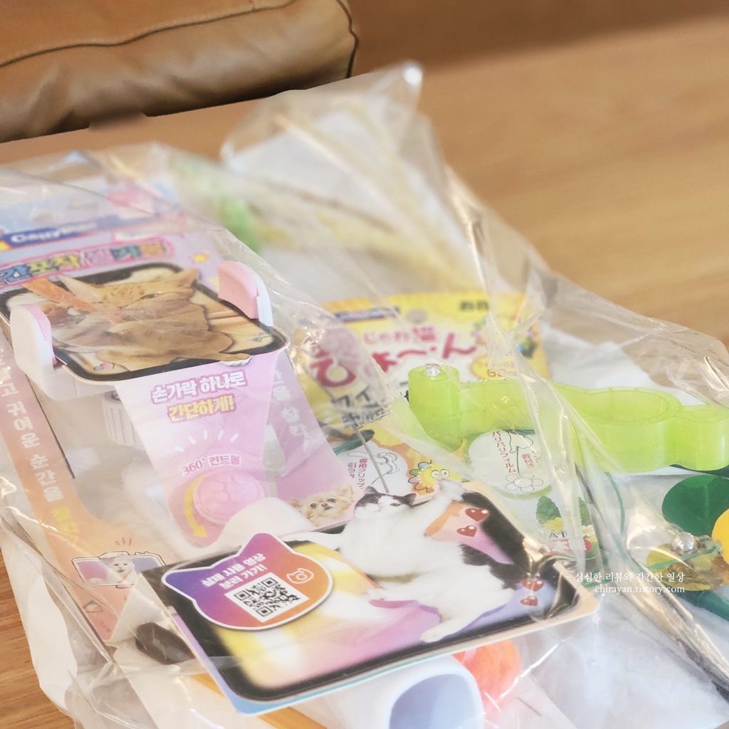 길게 말려있는 기본 장난감과 함께 억새풀, 강아지풀, 문고리 장난감이 동봉되어 있다.