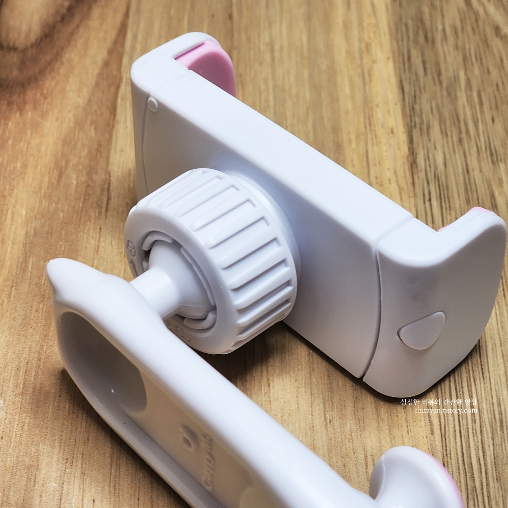 기기에 무리가 가지 않는 선에서 집게에 물린 후 뒷면의 캡을 조여 휴대폰의 각도를 고정한다.