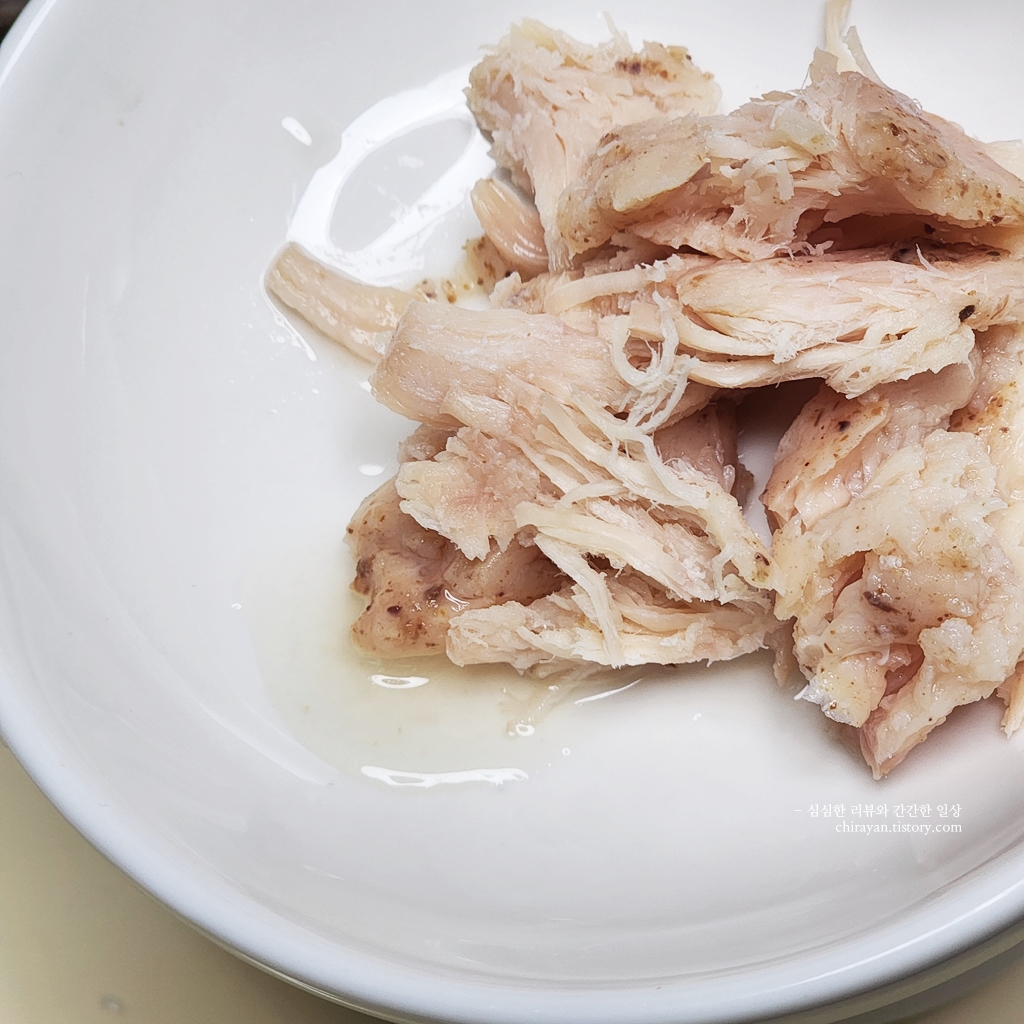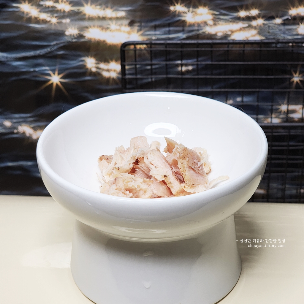 닭가슴살+국물 자작 제형의 원물간식을 급여한 사진.
