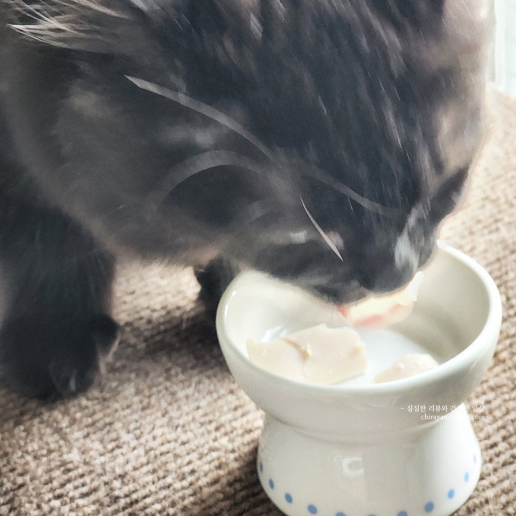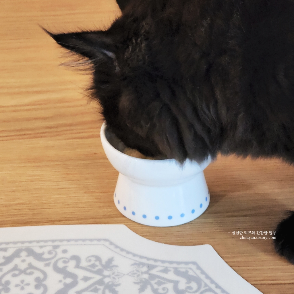 요 식기 덕에 납작하게 엎드려 먹지 않아도 편안하게 씹어먹을 수 있다.