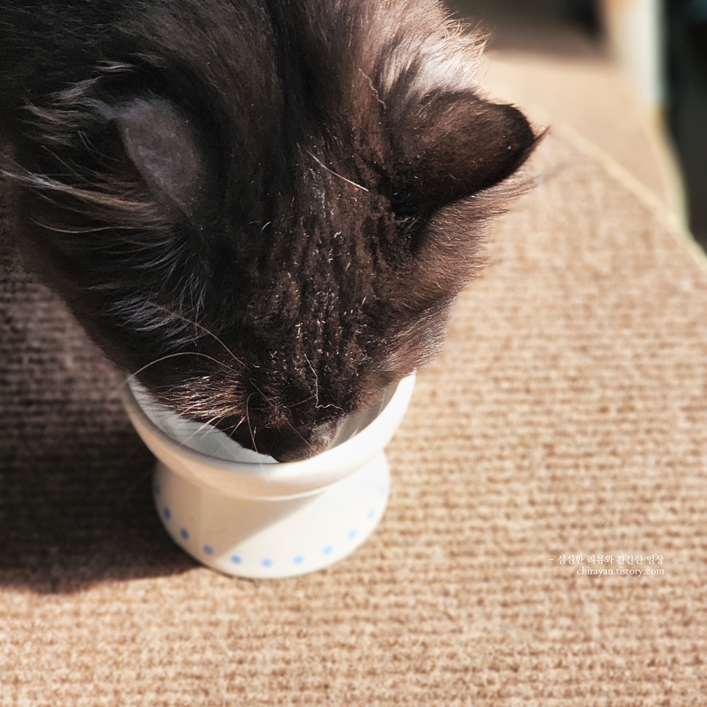 동그란 형태의 사료는 낮은 그릇에 담아 줬을 때 혀에 튕겨 굴러떨어지기 일쑤인데,