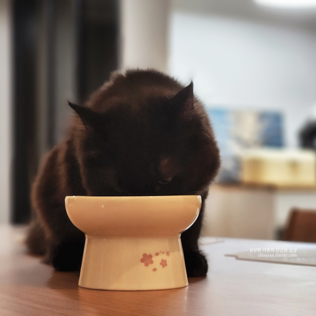 요 식기 덕에 납작하게 엎드려 먹지 않아도 편안하게 씹어먹을 수 있다.