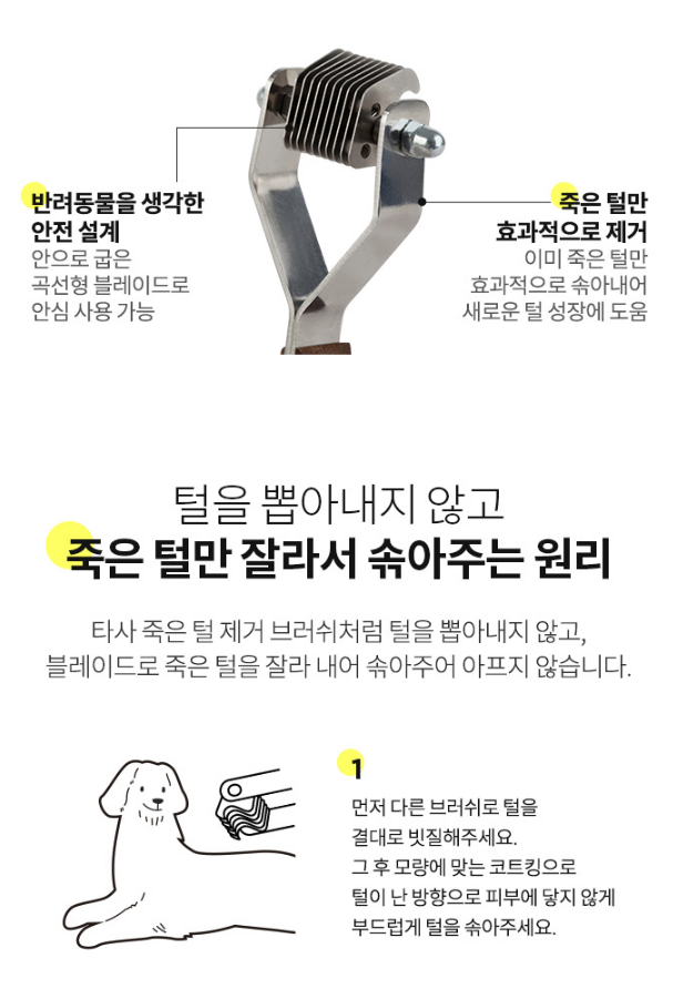 죽어서 엉킨 털을 부드럽게 끊어주어 당겨지는 통증이 없다.