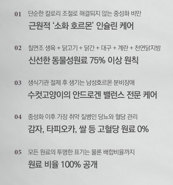 중성화 이후 더욱 중요해지는 "풍부하고 품질 좋은 동물성원료" 로 만든 사료이며