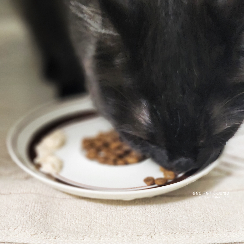 먼저 누터스픽을 핥고, 사료알로 옮겨간다.