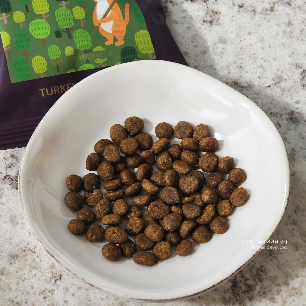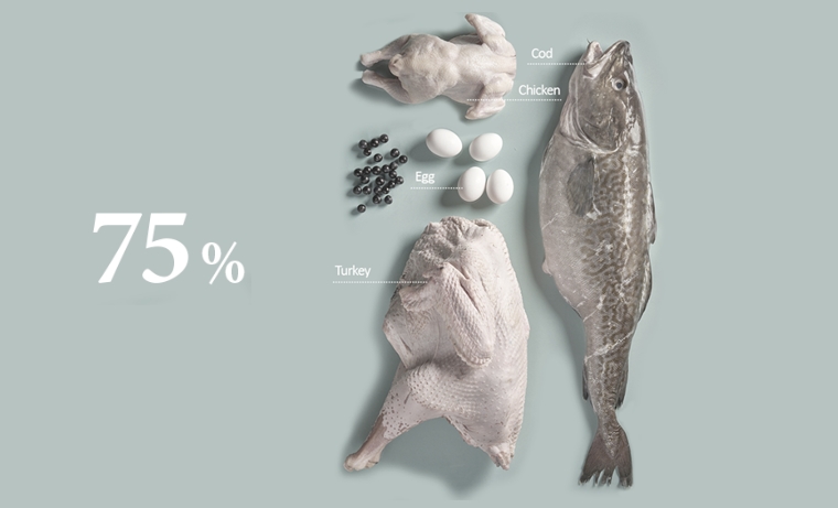 국내산 칠면조 생육 + 닭고기 생육 + 닭간 + 대구 + 계란 + 천연닭지방으로 75%를 꽉 채웠다.