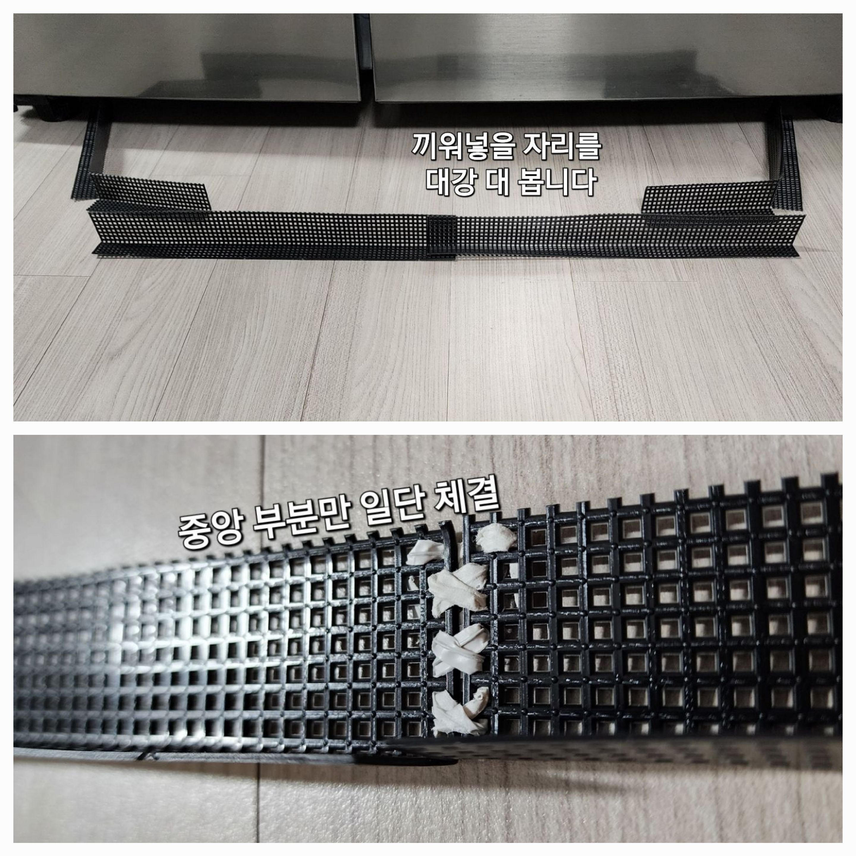 깔망을 자를 필요 없이 휘어서 벽과 냉장고 사이로 밀어넣습니다.