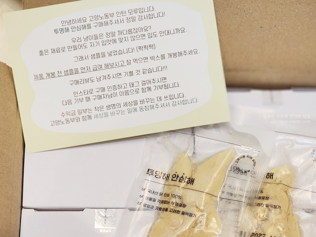 고양노동부라는 국내산 브랜드 한 곳을 지켜보고 있었는데 거기서 처음 런칭한 게 통살간식이라니 반가운 차였다.