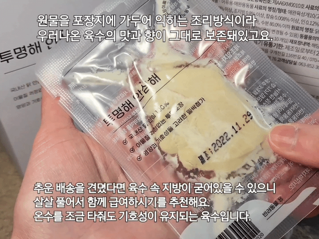 - 두꺼운 압축포장인데도 포장재질의 클리어함이 높은 덕에 육수의 상태까지 개운하게 확인 가능하다.