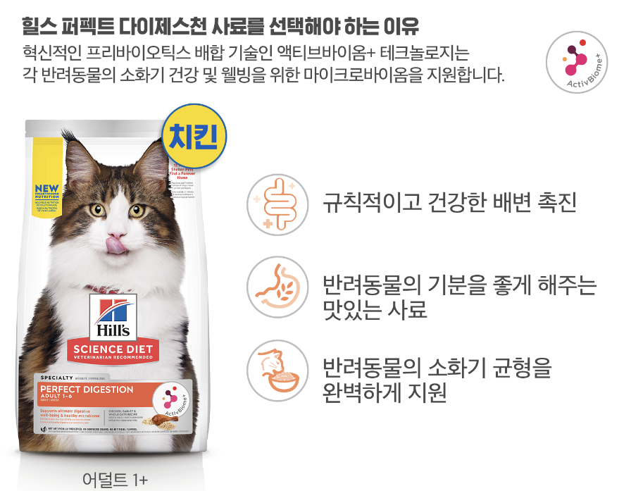 배변이 안정적이길 원한다면, 힐스 고양이사료 어덜트 퍼펙트 다이제스천 사료를 추천한다.