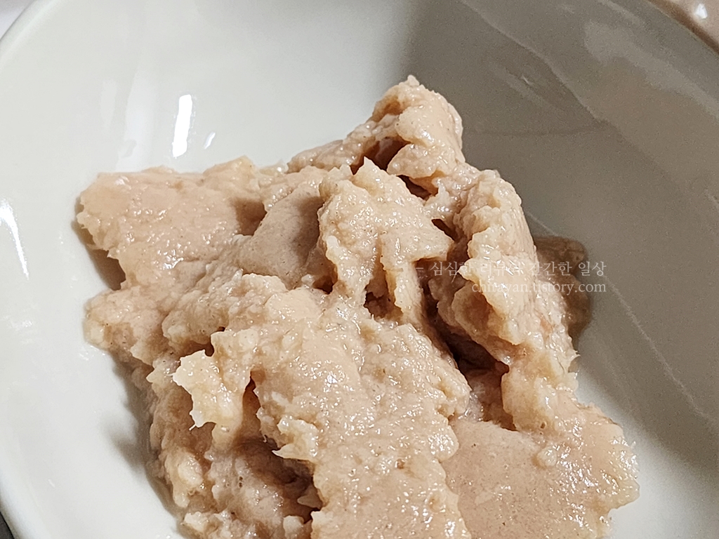 오늘은 간식대용으로 30g / 40g 나누어 급여했기에 온수 한스푼씩 타주었다.