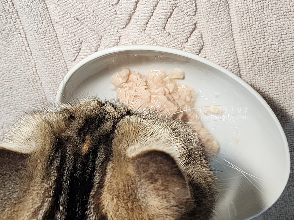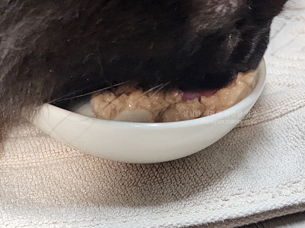 매일의 주식습식에는 물을 타주면 좋지 않다고 하니, 식사와 분리해서 츄르탕을 주거나 간식을 소량 줄 때에만 타주자.