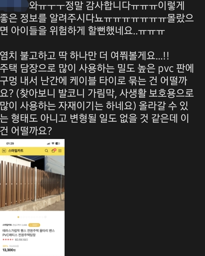 코팅철망 검색해서 줄간격 큰 그물형 사시고 대형 케이블타이로 난간의 안쪽에 고정해 두르시면 돼요.