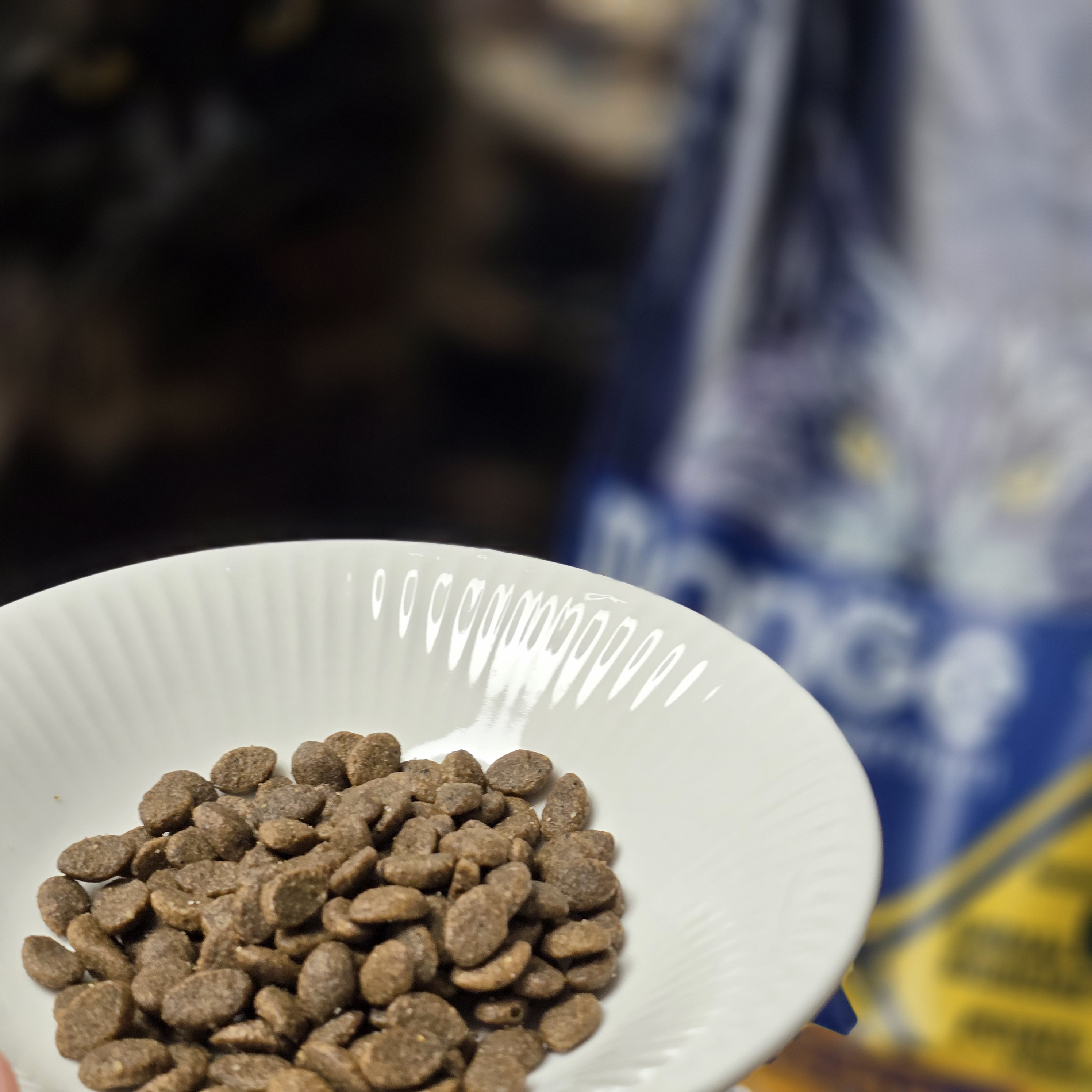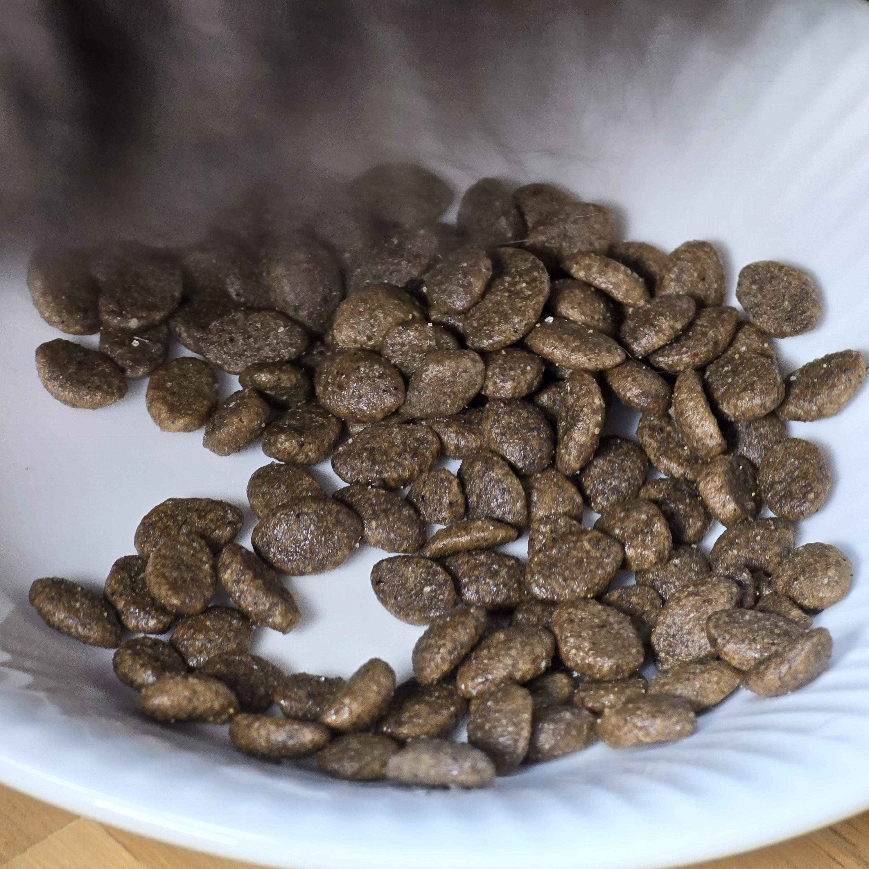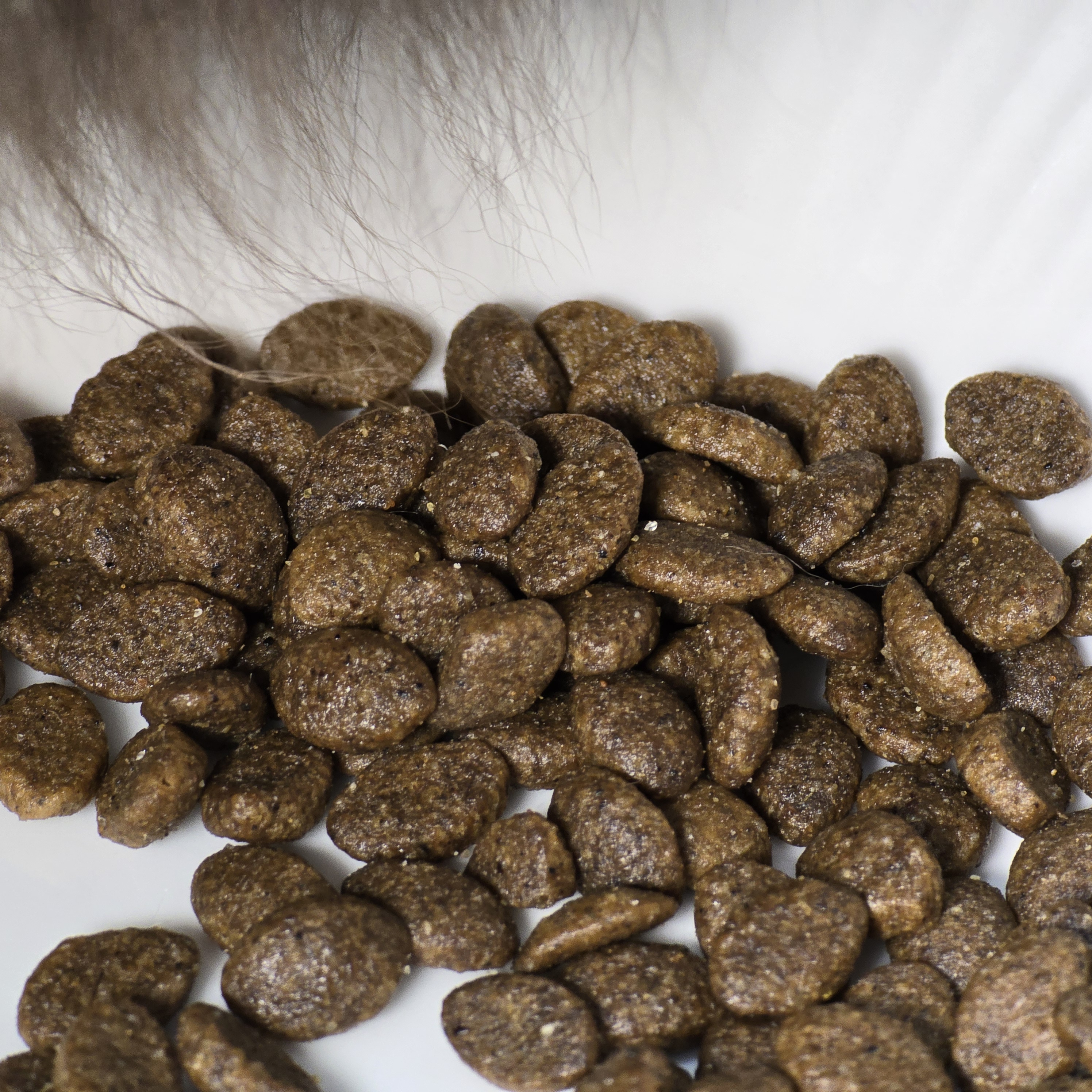 키블은 크지 않고(긴 쪽이 1cm 이하) 납작한 타원형 쌀알 형태로, 알갱이 크기에서 전연령 사료로 오해할 수 있으나