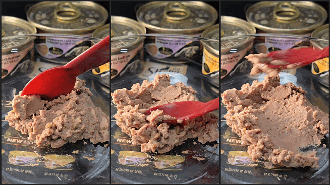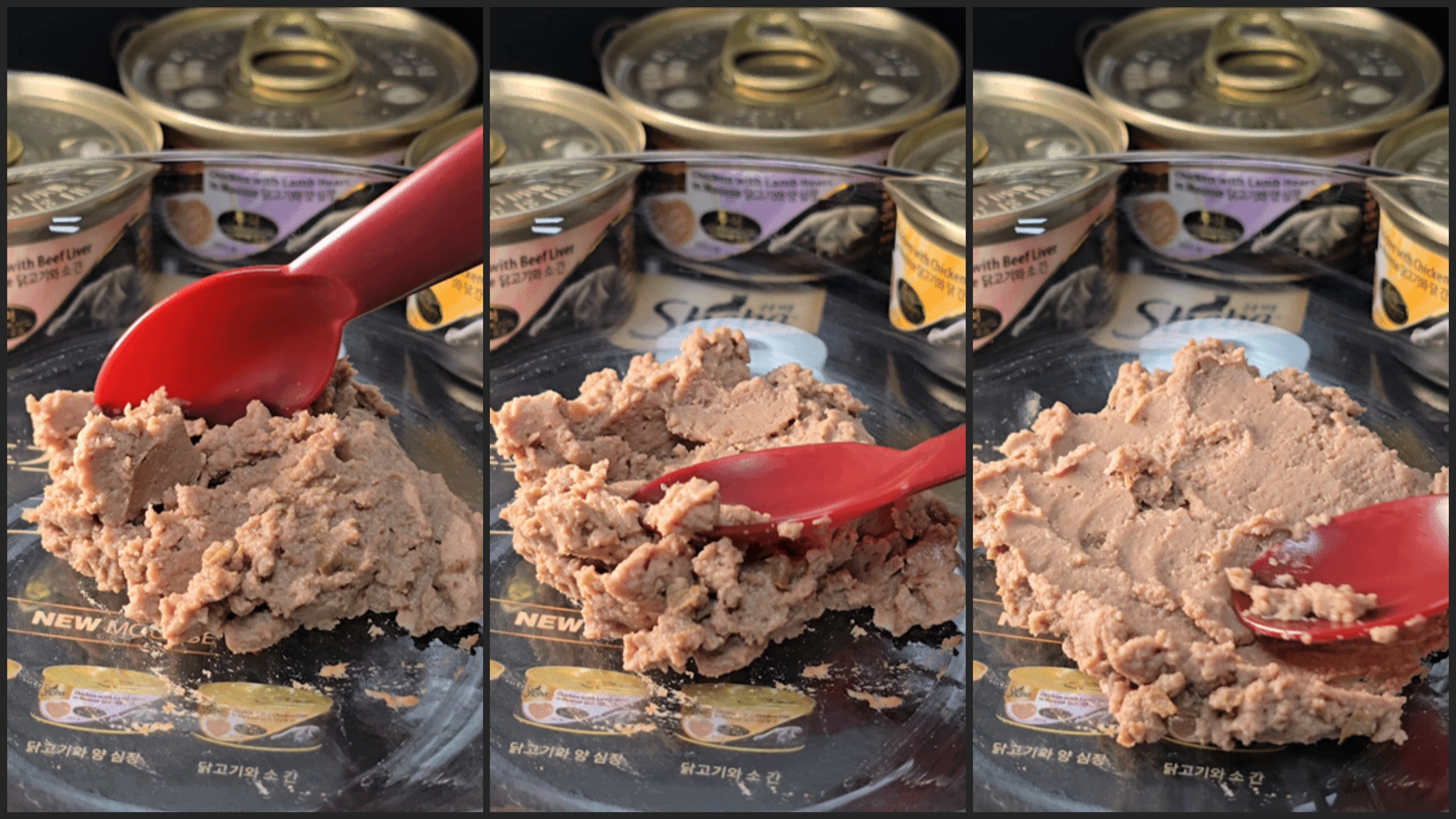 건더기와 국물의 양을 비슷하게 맞춰주려는 노력 없이 단지 무게만 맞춰 덜어주면 균일한 영양구성이 설계치대로 전달되는것 역시 무스형 주식습식의 장점이에요.